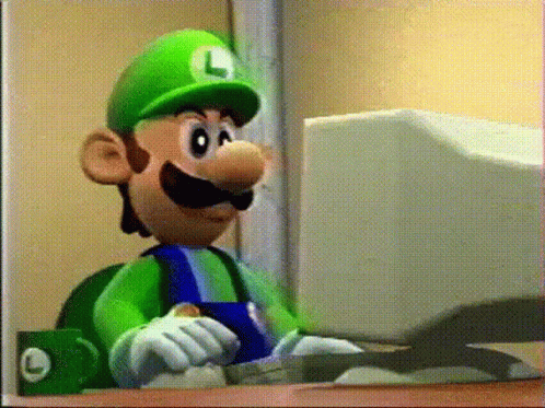 Luigi from Super Mario sits at a computer, turns to the camera, and gives a cheerful thumbs up.