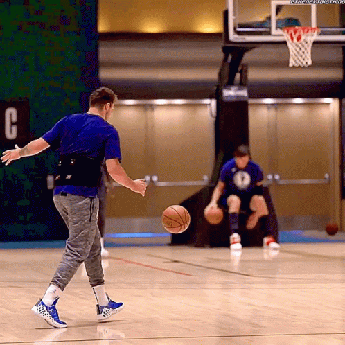 Luka Doncic kicks a basketball towards the hoop on a basketball court during a practice session.