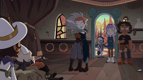 Luz Noceda and Amity Blight (Lumity) share a loving kiss in The Owl House, surrounded by friends.