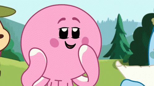 Luna Chip Inkie, a pink cartoon octopus, smiles with sparkling eyes in a forest setting.