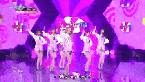 a group of girls are dancing on a stage with the words hey hey hey in the corner