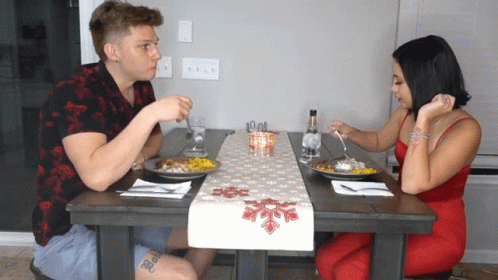 Brittney and Conner Bobay enjoy a cozy lunch date, dining together at a table with plates of food.