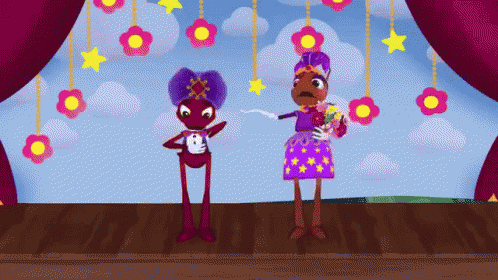 Luntik and a friend, dressed in festive attire, wave goodbye from a colorful stage decorated with flowers.
