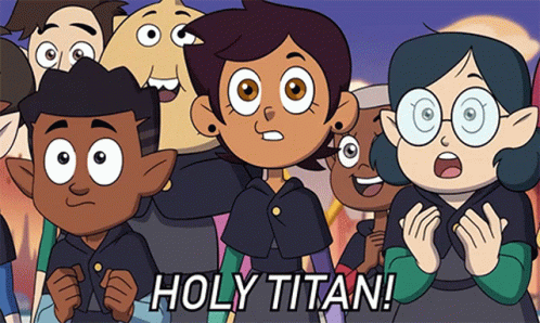 Luz, Willow, Gus, and other characters from The Owl House react with 'Holy Titan!' in this animated scene.