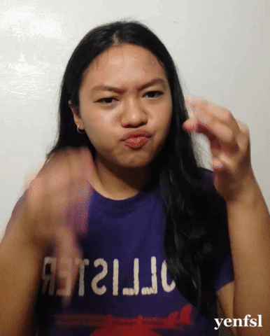 Laurienne demonstrates Filipino Sign Language (FSL) while wearing a purple shirt with 'yenfsl' on it.