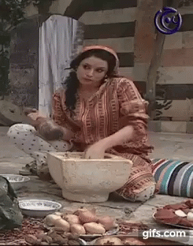 Lyali Alsalhiyeh pounding ingredients in a large mortar, preparing traditional kibbeh in a traditional setting.