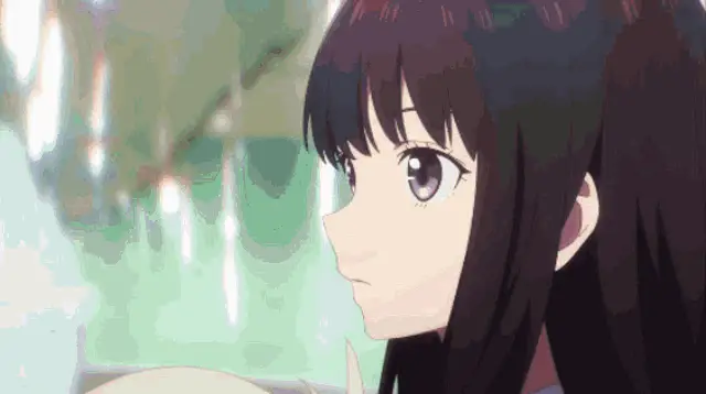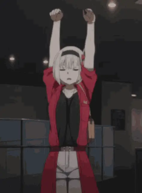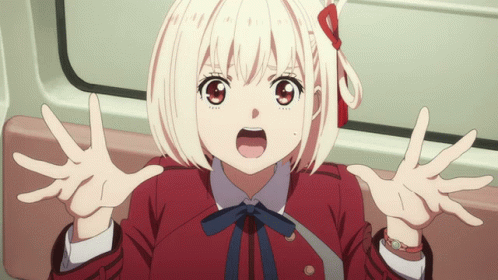 Chisato Nishikigi from Lycoris Recoil makes a surprised face, hands raised, with her signature short white hair.
