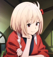 Chisato Nishikigi from Lycoris Recoil, a cute anime girl with blonde hair and a red jacket, smiling.