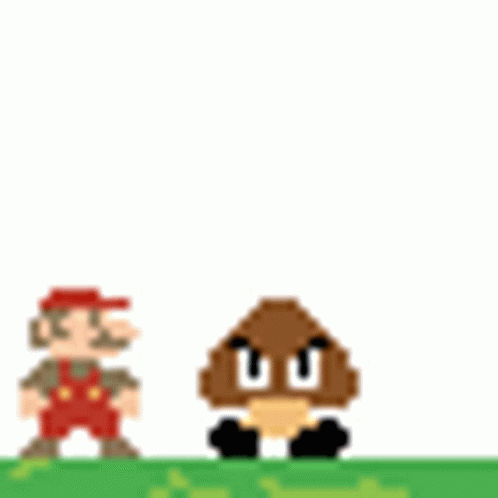 Pixel art Mario jumps on a Goomba, squashing it and collecting a coin in classic retro style.