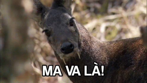 A close-up of a deer-like animal with prominent fangs, featuring the Italian phrase 'Ma Va Là!' on its face.