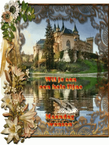 A beautiful castle reflected in a lake, wishing a very nice Monday in Dutch.