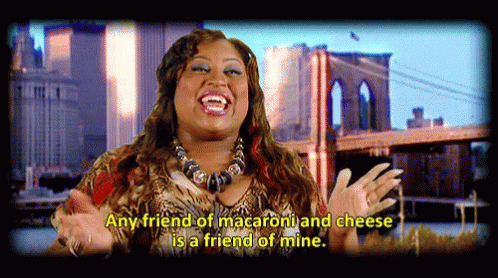 A woman joyfully declares, 'Any friend of macaroni and cheese is a friend of mine,' with a cityscape background.
