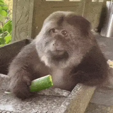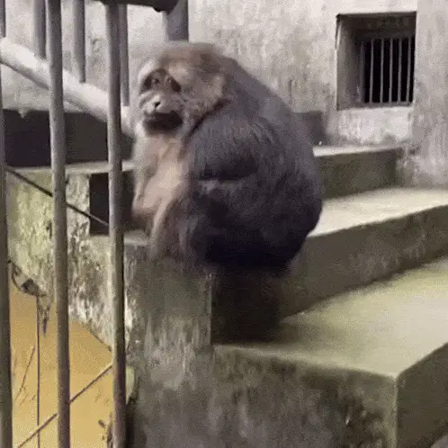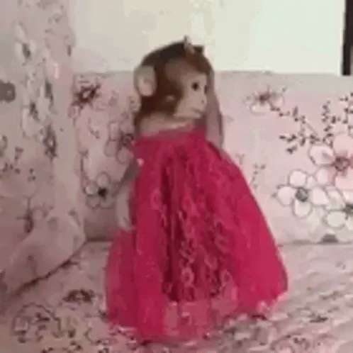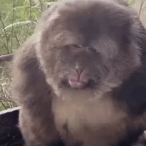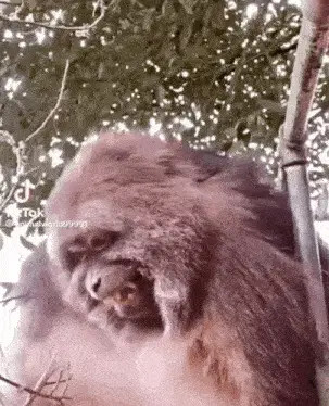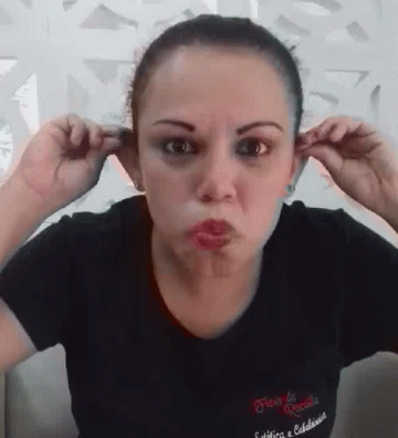 A woman makes a funny 'macaca' face, pulling her ears, puffing cheeks, and opening her mouth playfully.