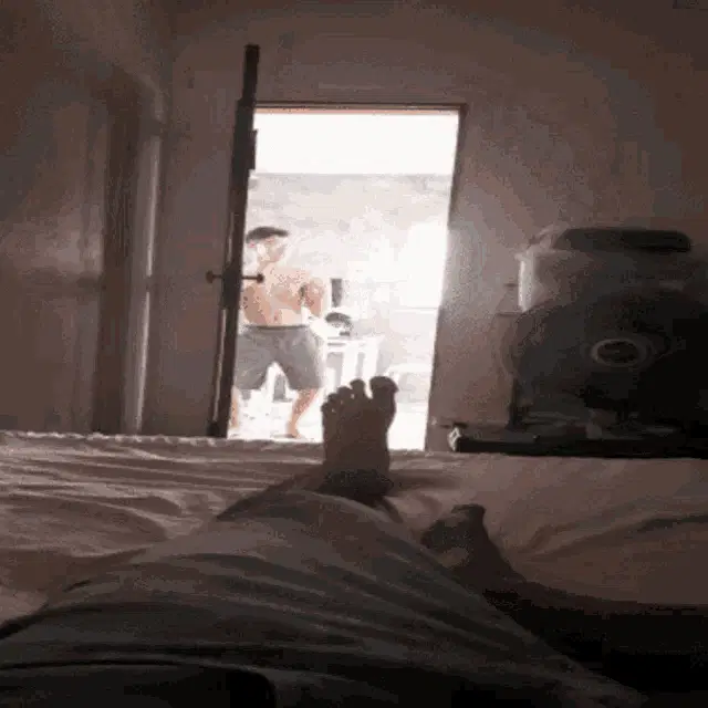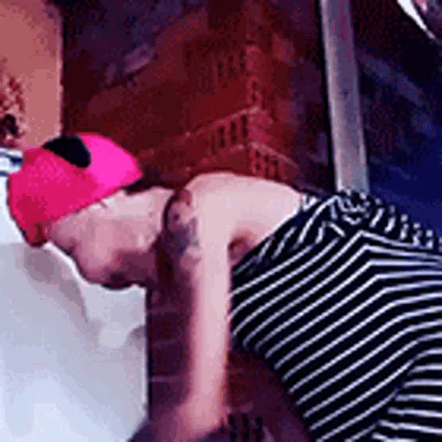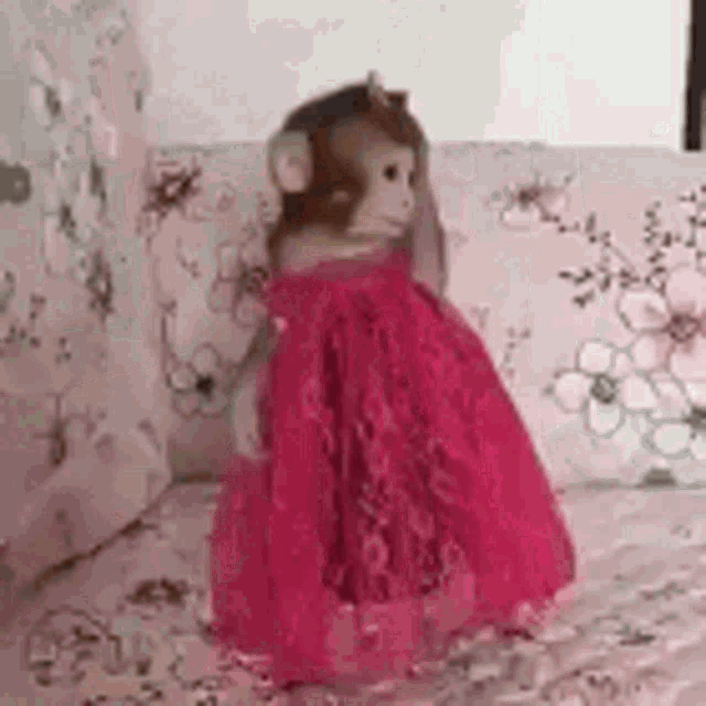 Little monkey in a pink dress stands and walks around a room, looking around curiously.