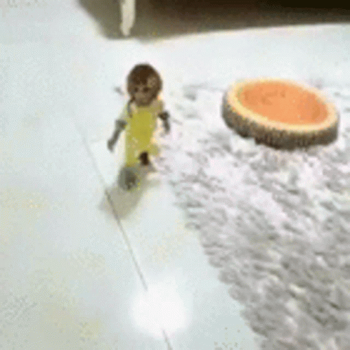 A baby in a yellow outfit walks on a white tiled floor next to a piece of fruit.