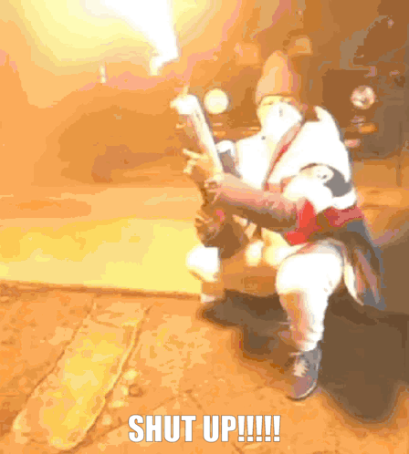 Mach-Hommy with a flamethrower, with the caption 'SHUT UP!!!!!'.