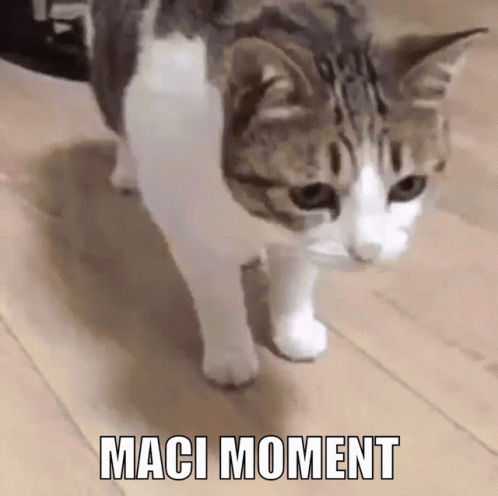 Maci the cat walks then dramatically flops onto the floor, creating a 'Maci Moment'.