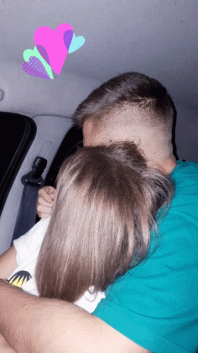 A man and Maci are hugging affectionately in a car, with animated hearts appearing above them.
