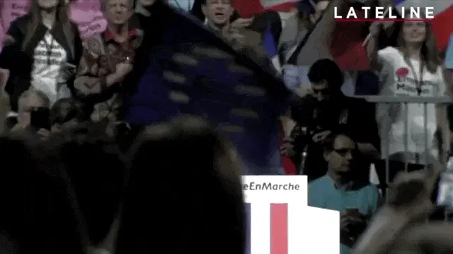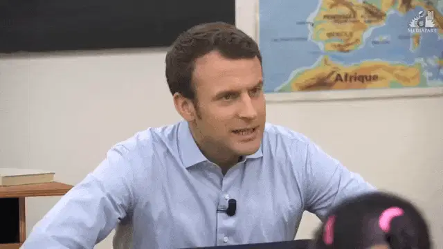 Emmanuel Macron, the French President, depicted in a military uniform with 'PAIX' (Peace) against a French flag.