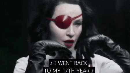 Madonna, wearing a red eye patch and gloves, performs as lyrics "I went back to my 17th year" appear on screen.