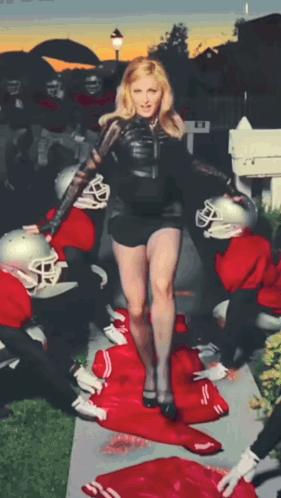 Madonna walking on a path of red football jerseys, surrounded by football players in a stylized scene.