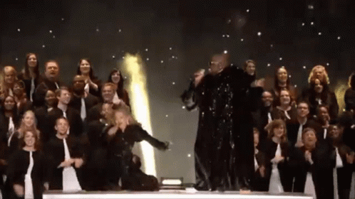 Madonna performs live at the Super Bowl with CeeLo Green and a large choir, delivering an energetic show.