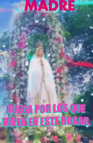 A statue of the Virgin Mary with the prayer 'Mother, pray for those who live in this home,' surrounded by flowers and butterflies.