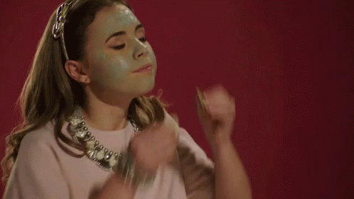 Maggie or Bianca from Fashion Friends applies a green beauty mask and cucumber slices to her eyes.