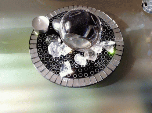 A decorative display featuring a large glass sphere, sparkling crystals, and a candle holder on a mirrored plate.