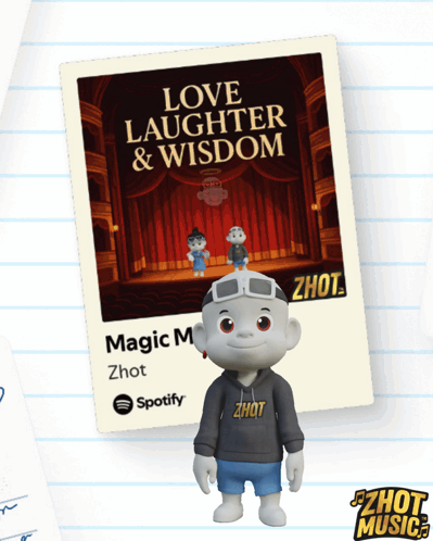 a cartoon character standing next to a poster that says love laughter and wisdom on it