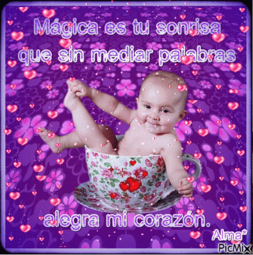 Smiling baby in a teacup on a vibrant purple background with hearts, a magical smile that brightens the heart.