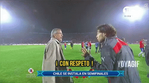 Mago Valdivia confronts a man on a soccer field, exclaiming '¡Con Respeto!' after Chile's semifinal win.