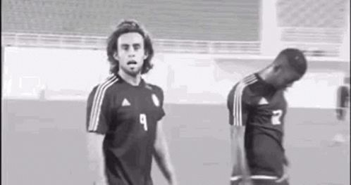 Mago Valdivia, a soccer player, looks directly at the camera with a surprised expression on the field.