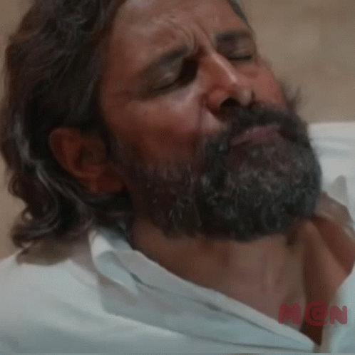 Actor Vikram from the movie Mahaan wakes up with a surprised and shocked expression.