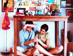 Indian actors Deepika Padukone and Imran Khan share a sweet, romantic cuddle under a wooden table.