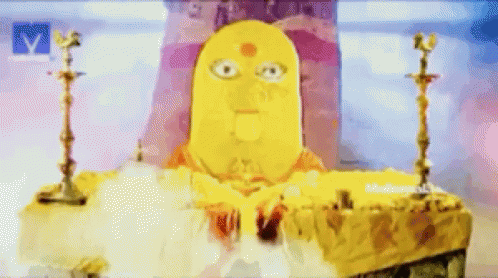 Mahakali Mata idol, a yellow figure with a red bindi, seated in a devotional setting with traditional lamps.
