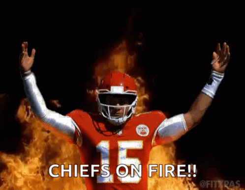 Patrick Mahomes, quarterback for the Kansas City Chiefs, stands amidst flames, embodying the team's fiery spirit.