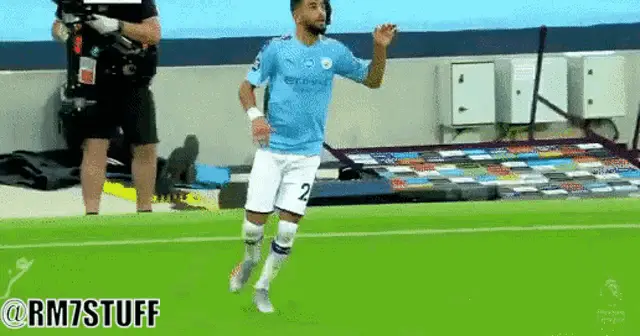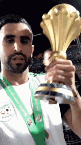 Riyad Mahrez celebrates with the Africa Cup of Nations trophy after a victory.