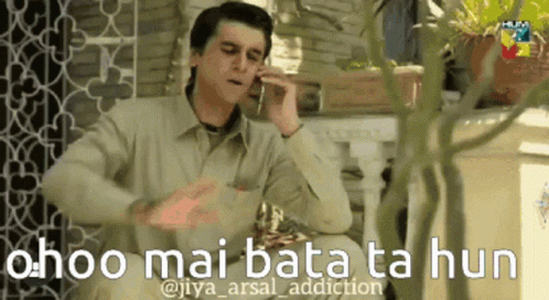 A man from the drama 'Suno Chanda' on a phone call, making a 'stop' gesture and saying 'Oh, I'll tell you'.