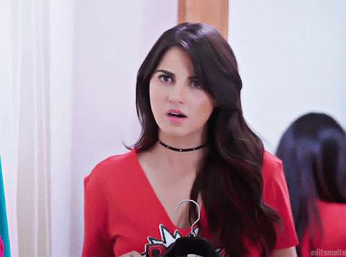 Maite Perroni looking thoughtful in a red shirt and black choker, from Papa A Toda Madre.