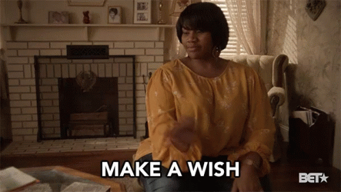 A woman in a yellow shirt gestures while saying 'Make A Wish' in a cozy living room setting.