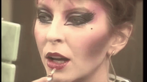 Elvira, Mistress of the Dark, applies her signature red lipstick, showcasing her iconic makeup look.