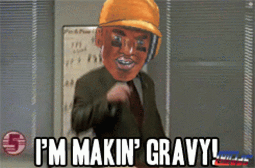The iconic 'I'M MAKIN' GRAVY!' meme featuring Chudds, wearing a baseball helmet and suit.