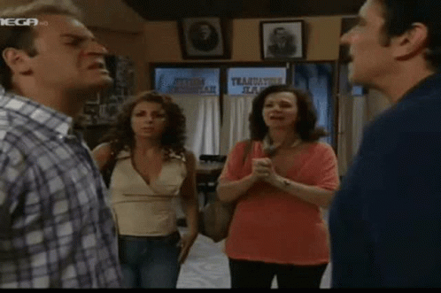 Makis Kotsampasis angrily confronts others, exclaiming 'Aren't you ashamed!' in a dramatic scene.