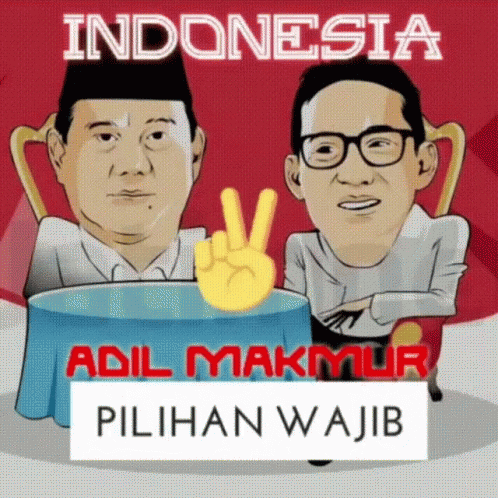 Cartoon of Prabowo and Sandiuno with 'Adil Makmur' slogan, featuring changing political messages in Indonesia.