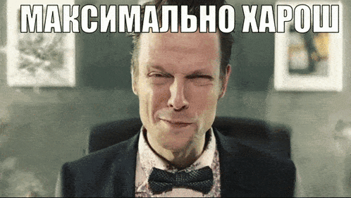 A man in a suit and bow tie winks and makes finger gun gestures with an explosion in the background.