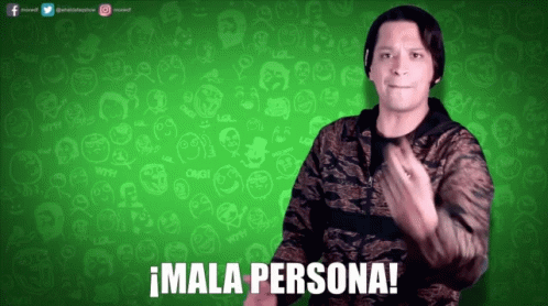 A man says 'Mala Persona!' (Bad Person!) with an expressive gesture in front of a green background with emoticons.