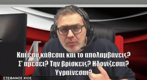 Stefanos Chios, the Greek journalist, provocatively asks "Are you aroused? Are you getting wet?" during a broadcast.