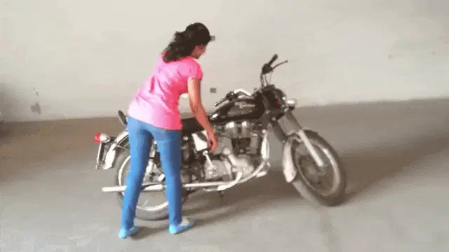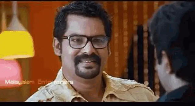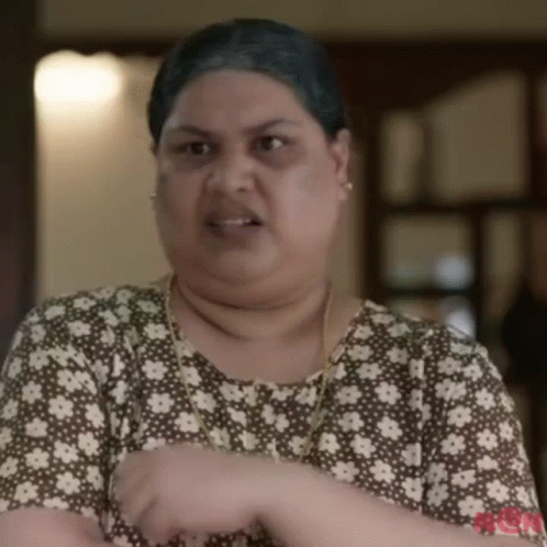 Woman from Jan E Man Malayalam Movie making a funny face in a brown and white floral shirt.