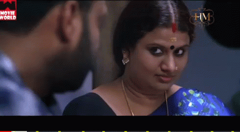 A woman in a blue saree gazes intently at Nahas in a scene from a Malayalam film, featuring a "Movie World" logo.